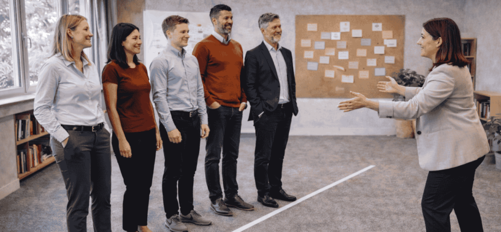 Die Linienaufstellung macht sichtbar, was sonst verborgen bleibt. Ohne lange Wortmeldungen entsteht ein klares Bild davon, wie die Gruppe wirklich steht – nicht nur die Lauten, sondern alle. Im Raum zeigt sich sofort: Wer steht klar an einem Pol, wer bewegt sich dazwischen, wer bleibt bewusst in der Mitte. Diese Verteilung ist kein Zufall. Sie ist ein Ausdruck von Haltung, Sicherheit und sozialer Dynamik. In einem Training zur Fehlerkultur markiert die Kursleitung zwei Pole. Nach wenigen Sekunden steht die Gruppe entlang der Linie – differenziert, ruhig, sichtbar. Die anschließende Diskussion startet nicht bei Meinungen, sondern bei Beobachtungen. Und genau dadurch wird sie deutlich präziser.