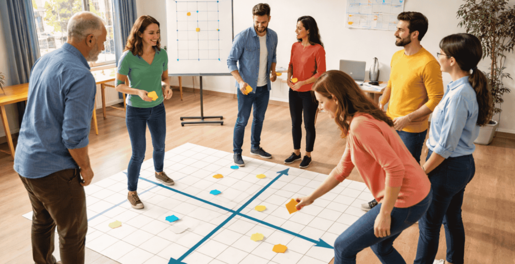 Die Fadenkreuzabfrage ist eine schnelle Methode, um Meinungen oder Einschätzungen in einer Gruppe sichtbar zu machen. Im Raum wird ein Kreuz aus zwei Gegensätzen angelegt, zum Beispiel „hoch – niedrig“ und „sicher – unsicher“. Die Teilnehmenden positionieren sich entsprechend ihrer Einschätzung im Feld. Der Effekt entsteht durch die räumliche Entscheidung: Unterschiede werden sofort sichtbar, ohne lange Diskussion. Gleichzeitig entsteht Gesprächsanlass, weil Positionen begründet werden müssen. Die Stärke liegt in der Klarheit und Aktivierung. Die Grenze: Komplexe Themen werden stark vereinfacht und feine Abstufungen gehen verloren.