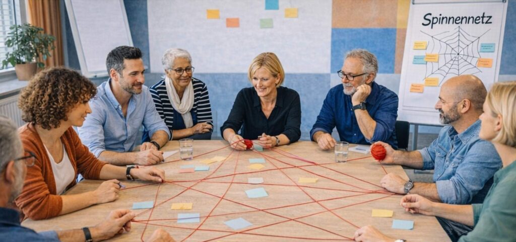 Spinnennetz ist schnell umzusetzen und braucht nur wenig Material, meistens reicht schon ein Wollknäuel. Die Methode macht sichtbar, wie Beteiligung wirklich verteilt ist, und bringt Dynamiken ans Licht, die sonst oft unbemerkt bleiben. Genau diese Ehrlichkeit macht sie so wirksam, weil sie direkt zeigt, wie es in der Gruppe wirklich läuft.