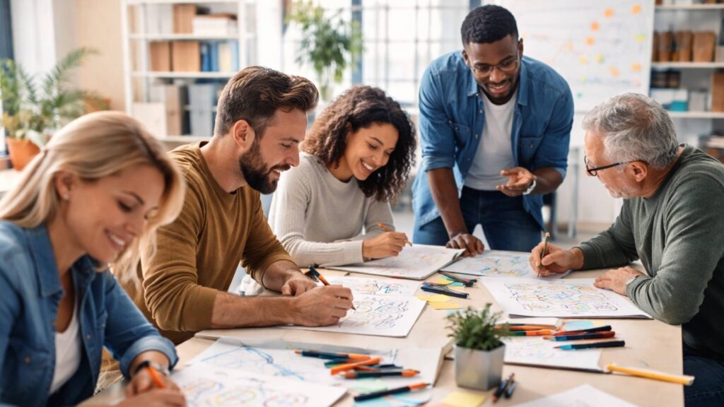 Statt mitzuschreiben, beginnen die Teilnehmer:innen zu filtern, zu strukturieren und sofort zu verarbeiten. Genau dadurch bleibt mehr hängen. Der Widerstand kommt fast immer am Anfang: „Ich kann nicht zeichnen.“ Sobald klar wird, dass einfache Symbole, Pfeile und wenige Worte reichen, kippt das schnell. Es geht nicht um schöne Bilder. Es geht darum, Inhalte beim Zuhören so zu greifen, dass sie im Kopf bleiben.